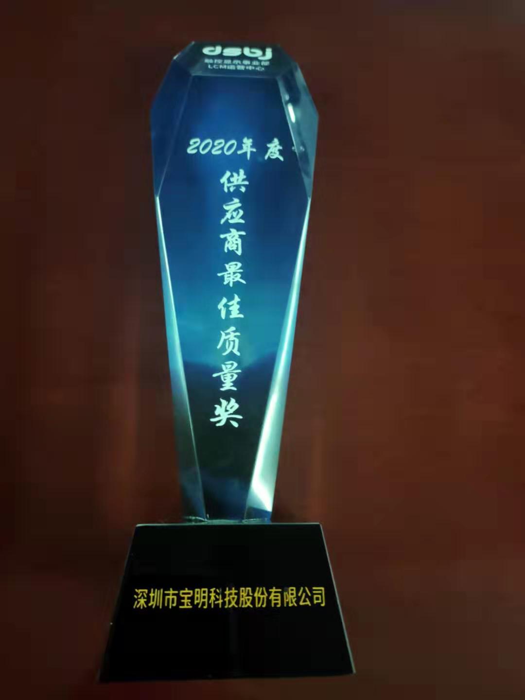 2020年我司以“品質、交期、服務”各方面綜合優(yōu)異表現榮獲東山精密2020年度“供應商最佳質量獎”,并獲頒獎杯。